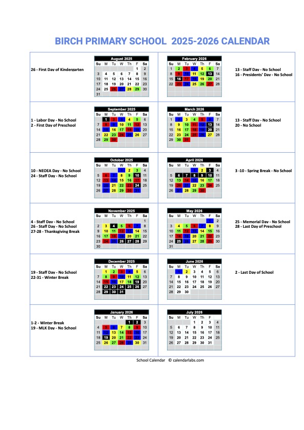 Please use the following calendar and schedule to determine which days your child has Art, Music, PE and Library.Birch Color Calendar 2025-2026.jpgColor Schedule by Teacher 2025-2026.jpg